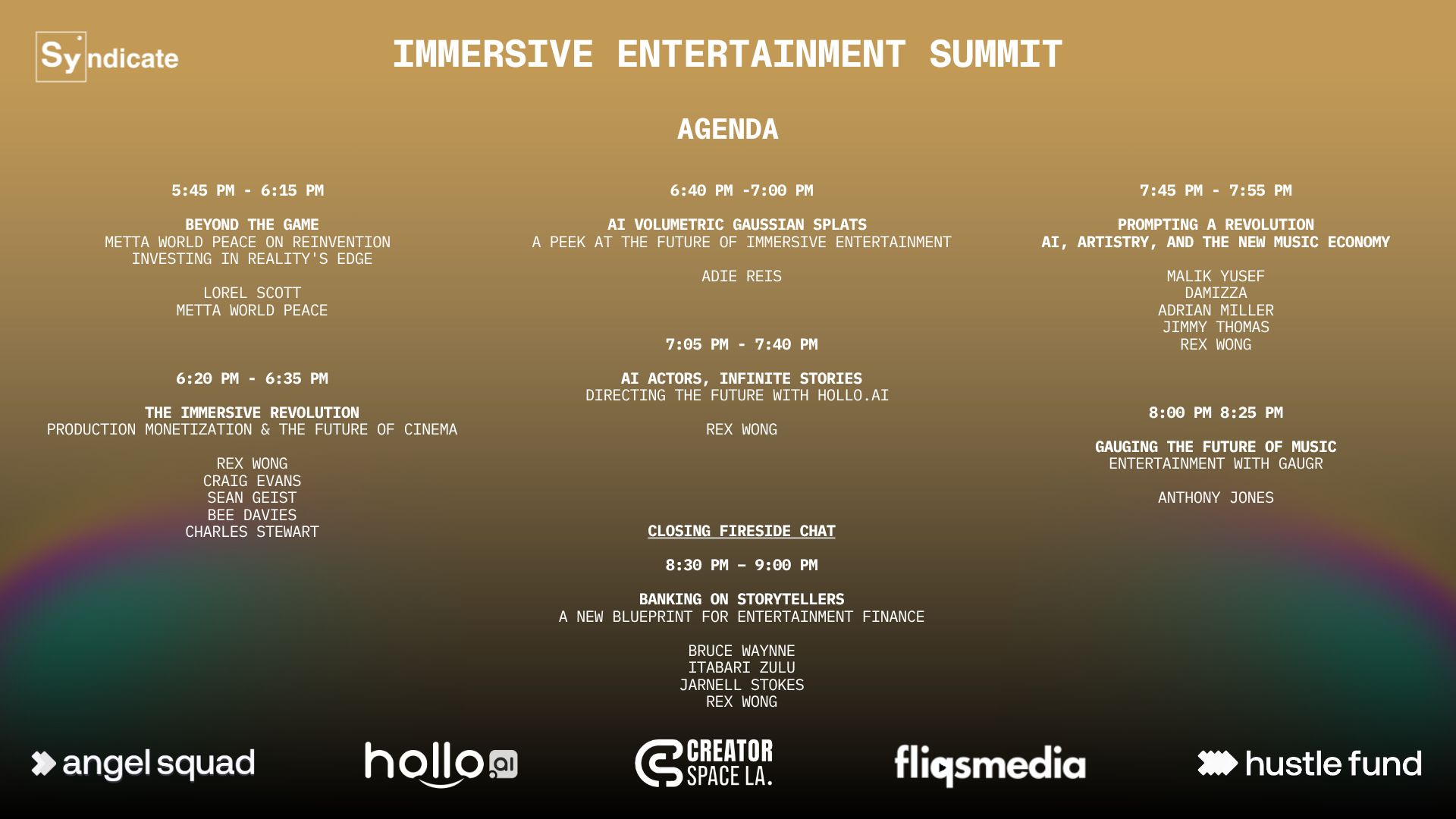 The buzz is real, but we're not done yet. Tonight, you can’t miss the headliners and experts at Immersive Entertainment Summit. Step directly into the future of content. We're diving deep into VR, AR, XR, AI generative video, and virtual production. You'll get to experience Digital Nation Entertainment's mind-blowing 4D volumetric gaussian splat studio at Creator Space LA, featuring over 120 cameras for capturing reality like never before. Plus, hear from cultural icons including 8x Grammy Award Winner Malik Yusef, former NBA star Metta World Peace, and legendary music producer Damizza.